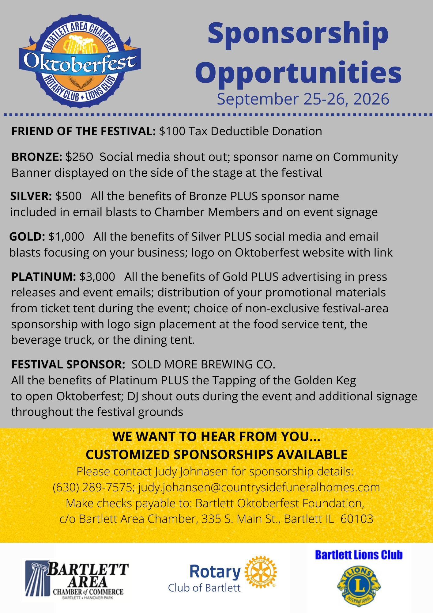 With all proceeds from the event going towards local non-profit organizations such as Bartlett Lions Club, Bartlett Area of Commerce, & Bartlett Rotary Club, your sponsorship provides vital support to essential causes that positively affect our city.